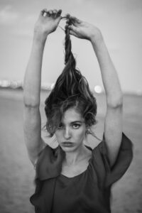 Su fotografía trabaja en ese espacio liminal entre el control y la entrega, entre la conciencia y el instante que simplemente sucede. En su obra, el retrato no captura, sino que acoge. No explica, sino que deja espacio para la pregunta. La imagen se convierte así en una suspensión mínima, un eco silencioso del instante compartido.
